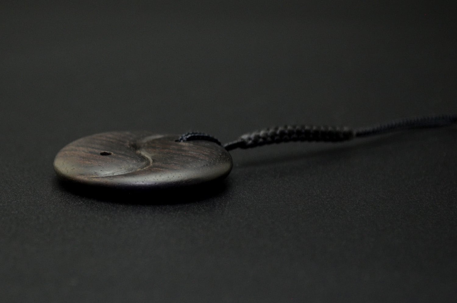 陰陽の原理をあらわす太極図の立体的な造形が、縞黒檀のなめらかな触感と融合しています。